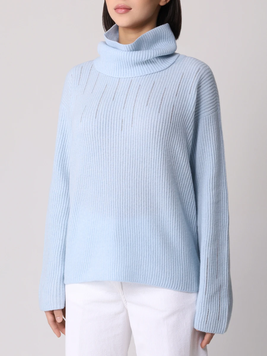 -Голубой вязаный джемпер из смесовой шерсти мериноса от TONET. -Модель свободного силуэта с фактурной вязкой, спущенной линией плеча, длинными рукавами, круглым вырезом горловины, съемным воротником-трубой. -Мелкая металлофурнитура в отделке добавляет изделию сдержанное мерцание.